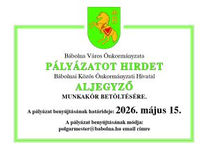 ÁLLÁSPÁLYÁZAT aljegyző munkakör betöltésére2026. február 27. | péntekRészletes információ a csatolmányban.Kapcsolódó dokumentumokallaspalyazat_aljegyzo_2026.pdf